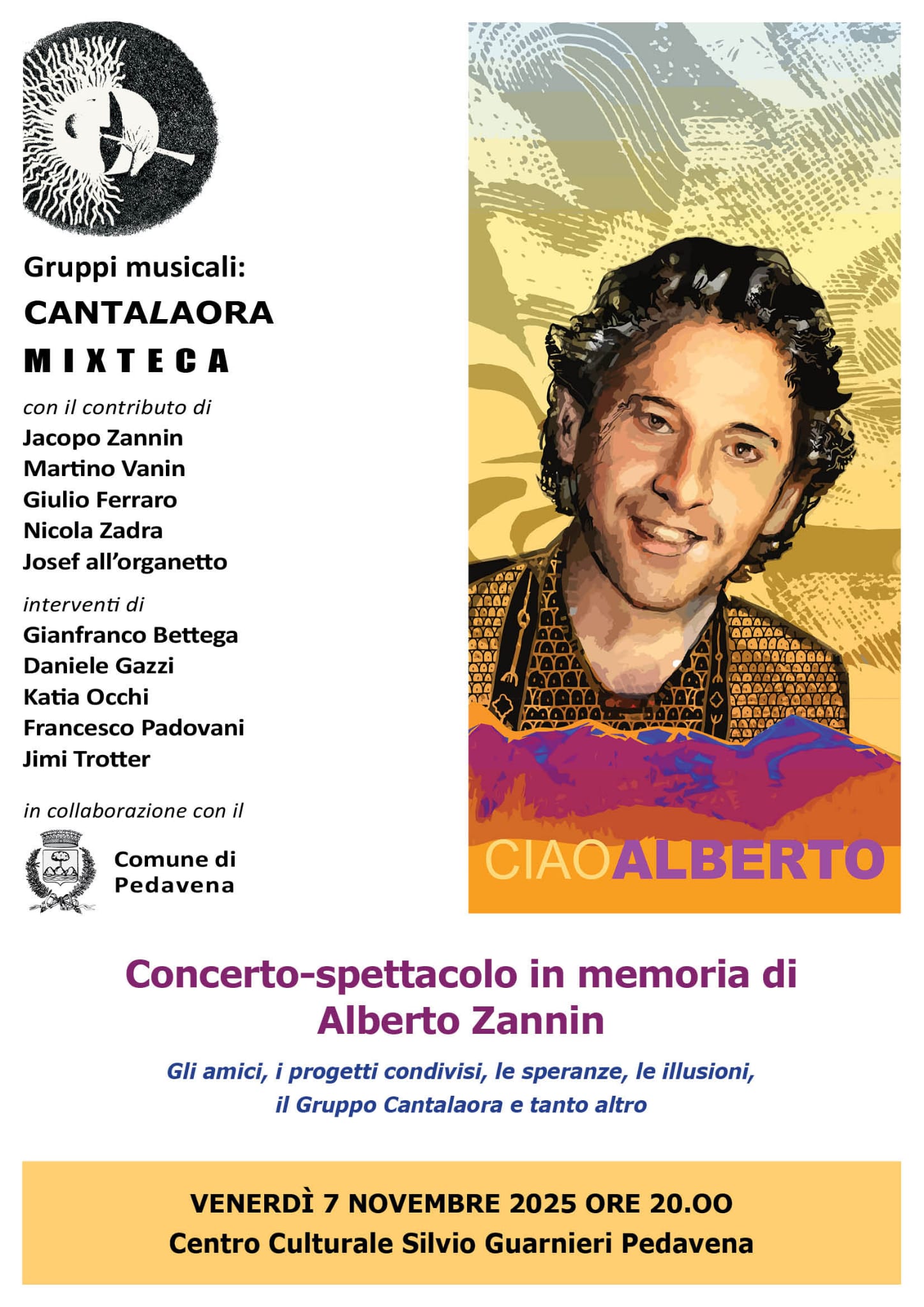 "Ciao Alberto" è il titolo assegnato ad una serata dedicata alla memoria di Alberto Zannin, mancato alla fine di aprile di quest'anno, organizzata da un gruppo di suoi amici al Centro culturale Silvio Guarnieri di Pedavena, in collaborazione alla locale Amministrazione comunale, venerdì 7 novembre alle ore 20.00. Non sarà una semplice commemorazione, ma un vero e proprio concerto-spettacolo, che cercherà di ricostruire attraverso musiche e testimonianze le molteplici attività di cui Alberto si è reso spesso protagonista: un modo questo anche per rievocare le vicende socioculturali che hanno coinvolto un'intera generazione, a partire dalla metà degli anni Settanta del Novecento fino ai primi decenni del nostro secolo.