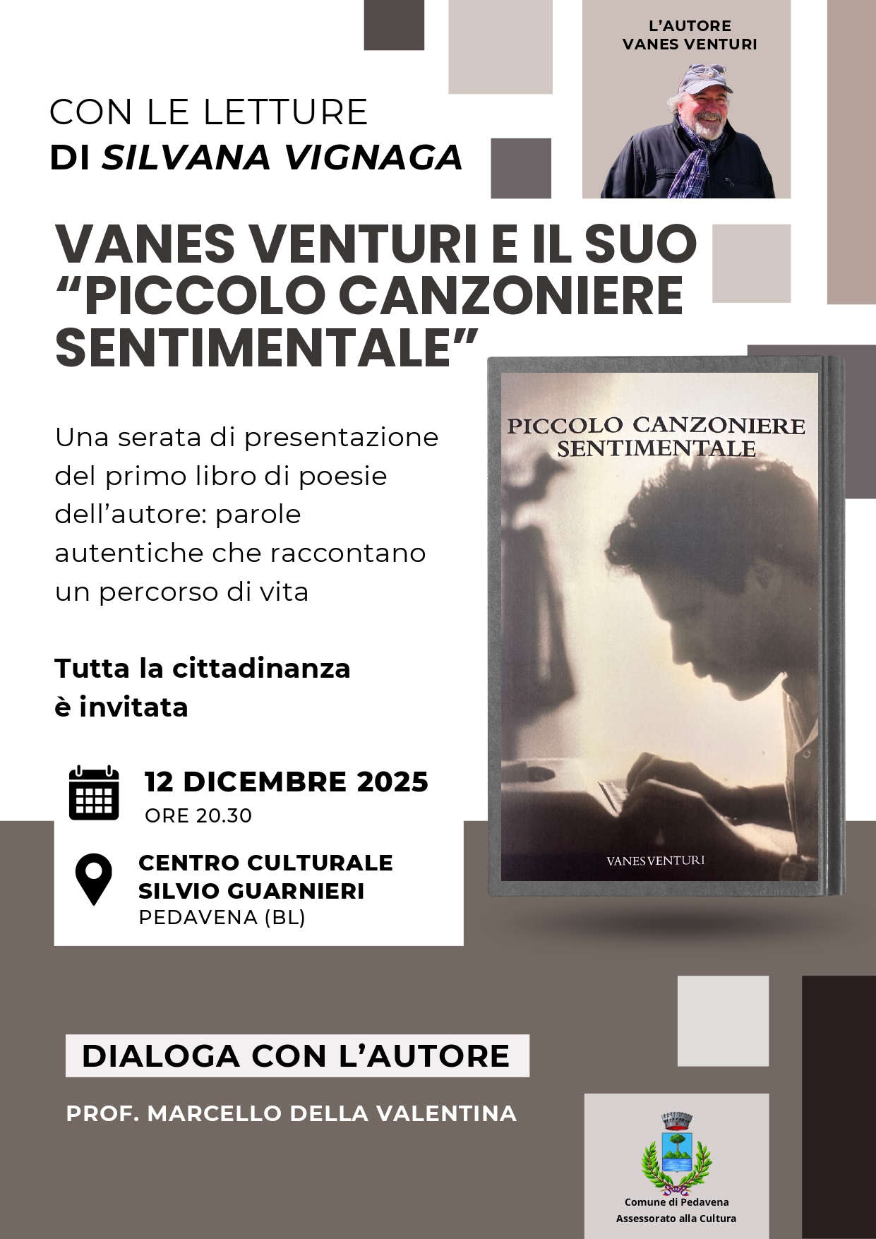L’Amministrazione Comunale invita la cittadinanza alla presentazione del primo libro di poesie di Vanes Venturi, Piccolo canzoniere sentimentale, venerdì 12 dicembre 2025, alle ore 20:30, presso il Centro culturale Silvio Guarnieridi Pedavena.