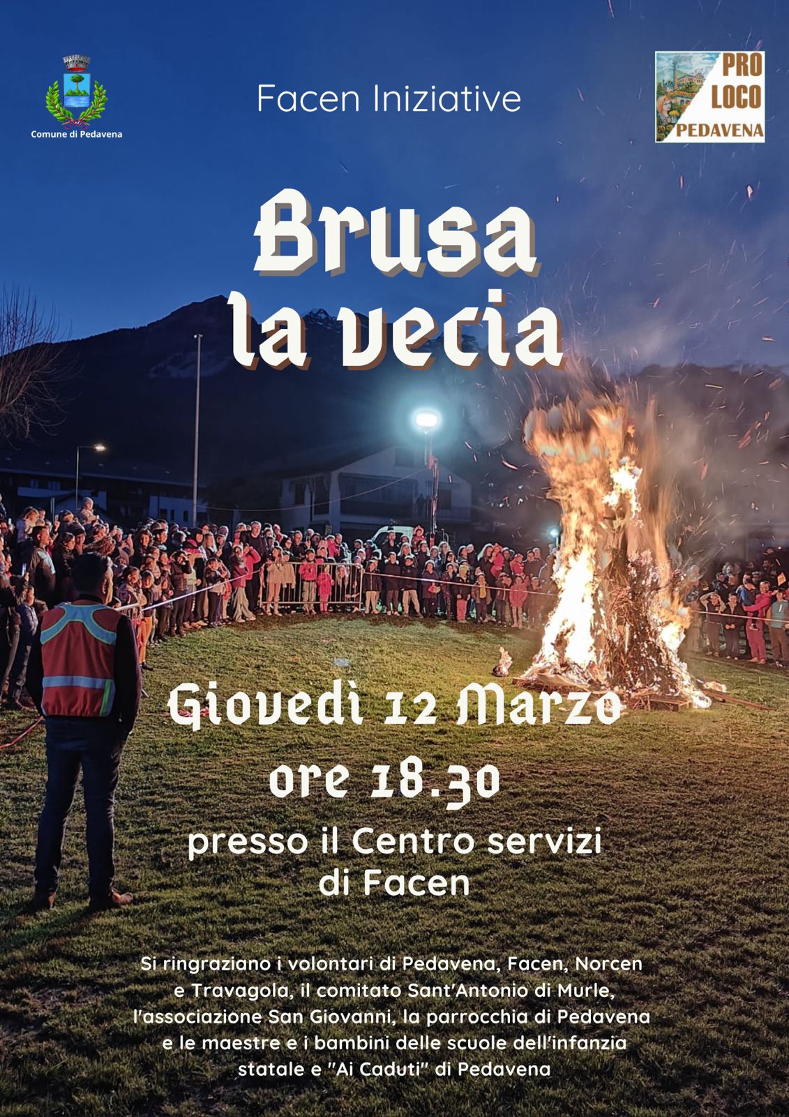 Il Brusa la Vecia è organizzato dal Comune di Pedavena, dalla Pro Loco, dall’associazione Facen Iniziative e dai volontari di Pedavena, Facen, Norcen e Travagola, con la collaborazione del Comitato Sant’Antonio di Murle, dell’associazione San Giovanni, della Parrocchia di Pedavena e delle maestre e dei bambini delle scuole dell’infanzia statale e “Ai Caduti” di Pedavena.