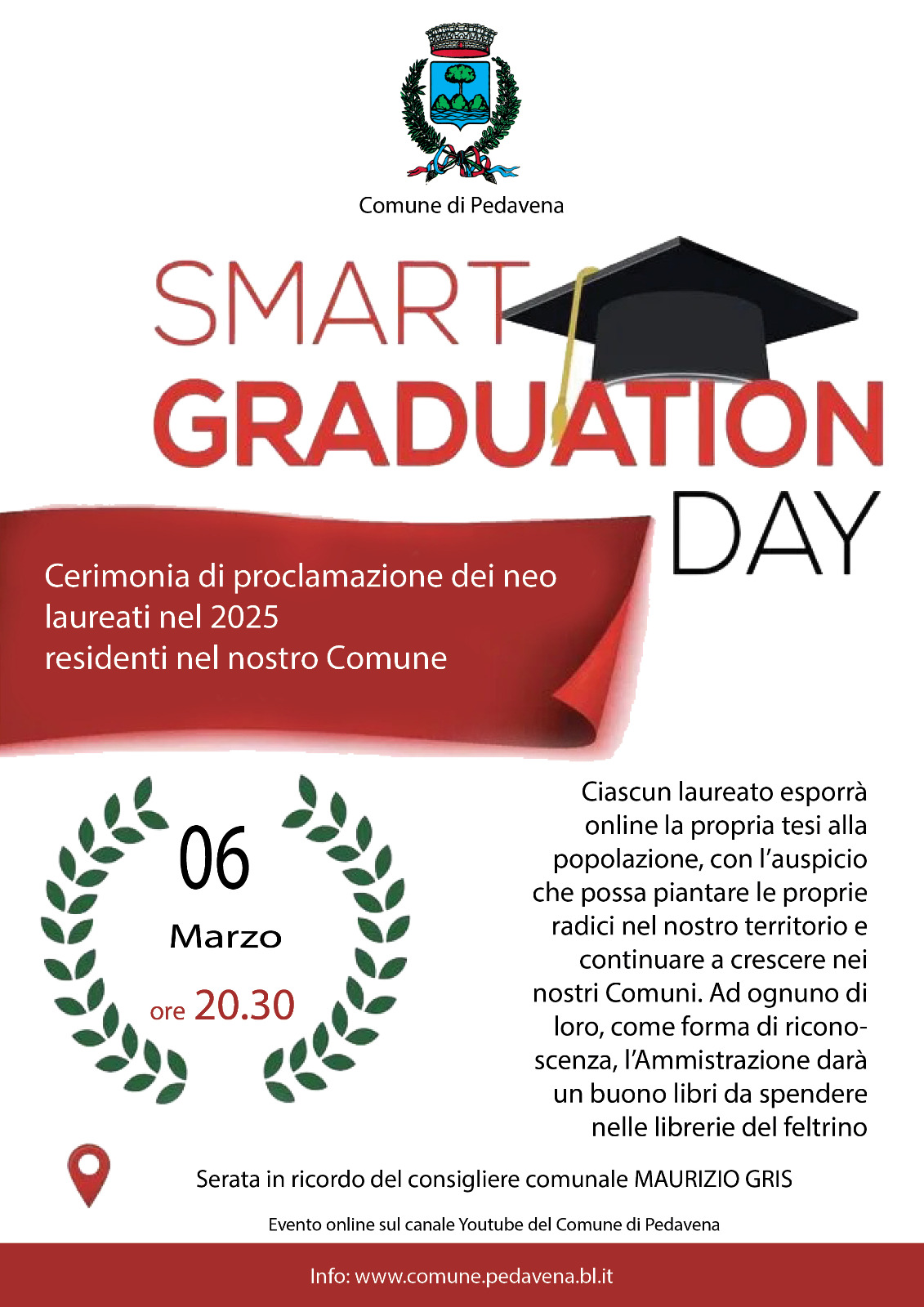 Un momento speciale, venerdì 6 marzo 2026 alle ore 20:30, per celebrare l'impegno universitario dei giovani del nostro territorio. Durante l’evento, ciascun laureato presenterà online la propria tesi alla cittadinanza, condividendo il proprio percorso di studi con l’auspicio di crescere e contribuire alla comunità locale. In segno di riconoscenza, l'Amministrazione comunale consegnerà un buono libri da utilizzare nelle librerie del Feltrino. La serata sarà dedicata al ricordo del consigliere comunale Maurizio Gris. La diretta sarà disponibile sul canale YouTube del comune di Pedavena.